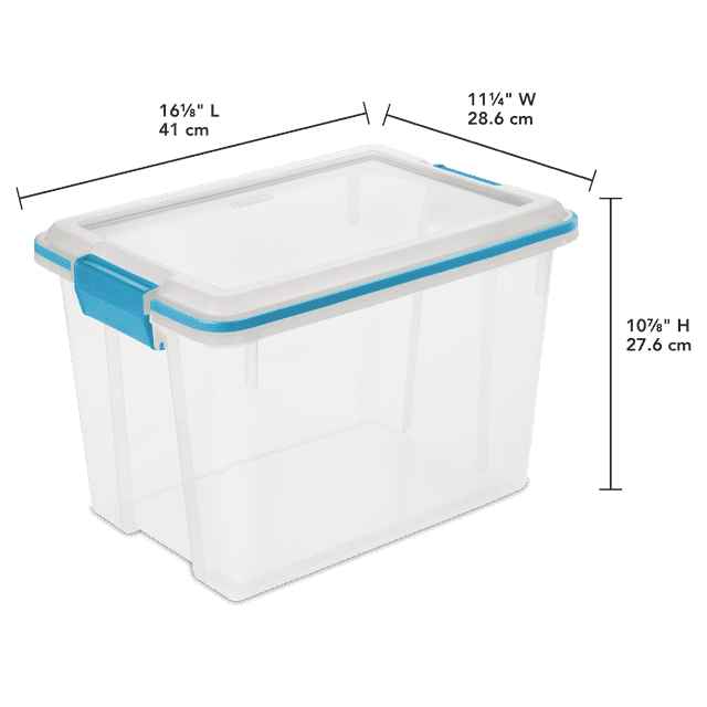 s Gasket Box line is the ideal storage solution for keepsakes, photographs, important documents, linens, and other items that need to be stored away and protected. Gasket Boxes offer a gasketed seal to safeguard items from both air and moisture, keeping those special belongings safe from the elements, dust and pests. Durable, tight-fitting latches keep the lid secured to the base, and the clear lid and base allow contents to be easily identified, without opening the lid. The 20 Quart size is ideal for organizing school projects, paperwork and photographs that need to be protected, and fits conveniently on 16" wire closet shelving, making it ideal for organizing and storing small items in the closet. The gasketed seal also helps to keep pet food and other bulk foods fresh longer. The Gasket Box line has eight sizes, ranging from 7.5 Qt to 120 Qt, providing a variety of storage options for those items that need to be kept safe as well as for longer term storage needs. The 12 Qt and 20 Qt Gasket Boxes use the same lid, allowing both the shallow and deep sizes to be stacked in same footprint. The overall assembled dimensions of this item are 16 1/8" L x 11 1/4" W x 10 7/8" H.